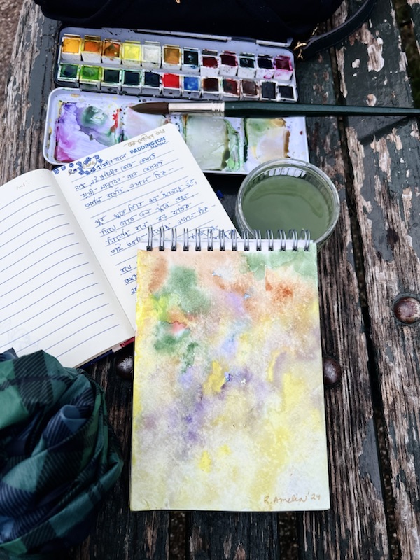 The air was sharp with a biting wind, the sky heavy with clouds. Yet, I discovered a certain beauty in the way the dry leaves twirled like dancers in the swirling wind, crafting their own brittle symphony beneath my feet. I wandered for miles, from the elegance of the Italian Gardens to the heart of Kensington, eventually finding myself standing by the Round Pond. There, I felt urge to paint something, anything, and I scattered color across my blank cold-pressed watercolor paper, watching as the hues bled and merged into mesmerizing patterns. It was a sight that captivated the mind, the way the colors flowed like thoughts unfolding. As Picasso once said, ‘Every child is an artist. The problem is how to remain an artist once we grow up.’ I felt that childlike joy, watching the colors breathe life into the paper. I always do feel like this