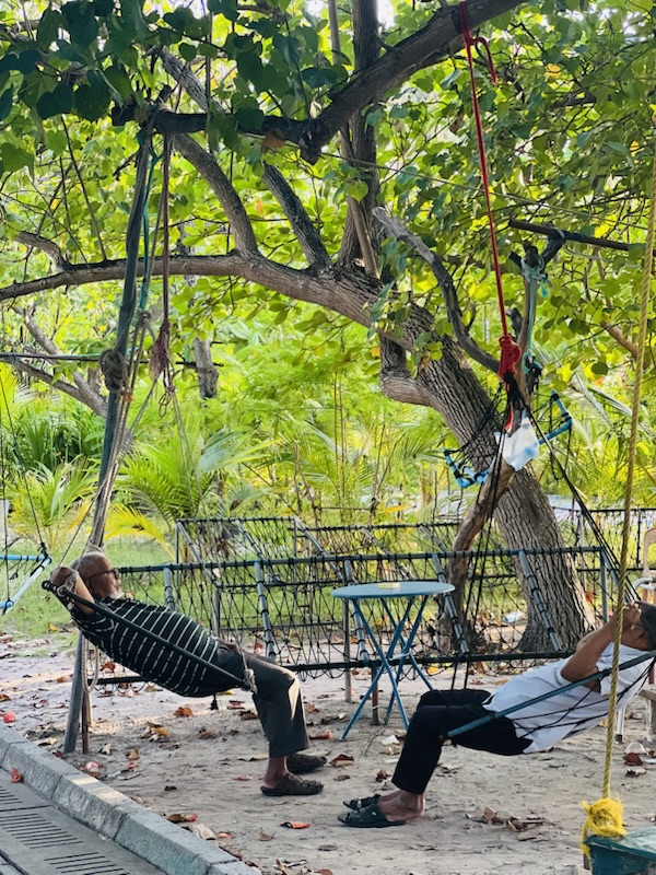 Everywhere we looked, there were tiny glimpses of humanity, sweet nothings, really, but the kind that make a place unforgettable. We saw two youngsters sitting on a swing, lost in deep conversation, as if the world around them had vanished. Just a little further down, two elderly citizens mirrored the same scene, also on a swing, equally absorbed in their own quiet exchange. It struck me how conversation, across generations, had found its sacred space here